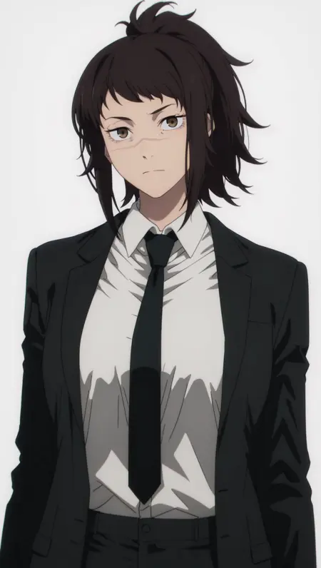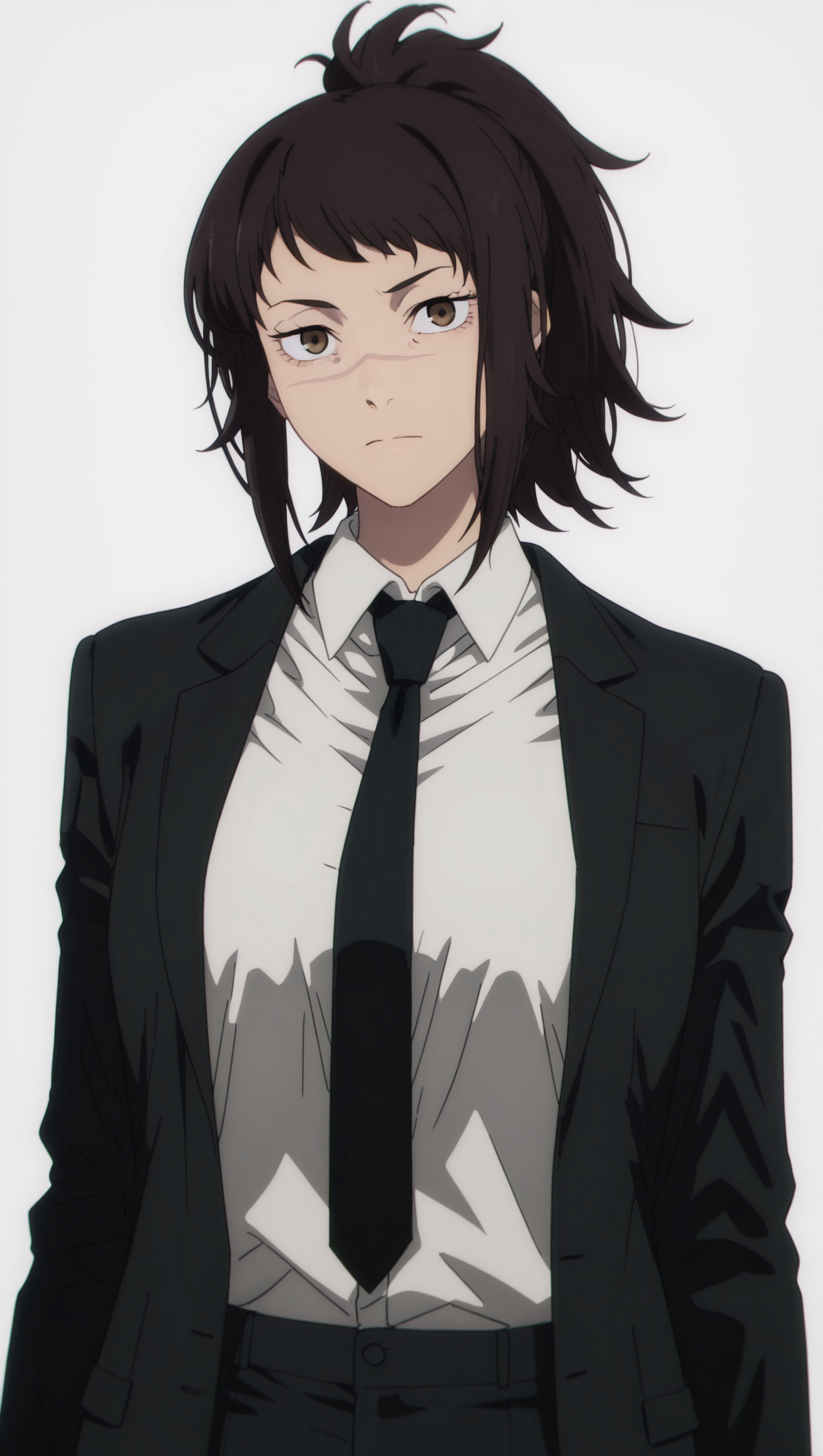 ((动漫上色)), 杰作,最佳画质,惊人画质,michikotendo,1名女孩,长发,棕色头发,马尾辫,棕色眼睛,中等胸部,脸上有疤痕,衬衫,白色衬衫,有领衬衫,领带,夹克,黑色夹克,裤子,黑色裤子,单人,姿势,站立,正面视角,看向观众,(((白色背景,简单背景)))