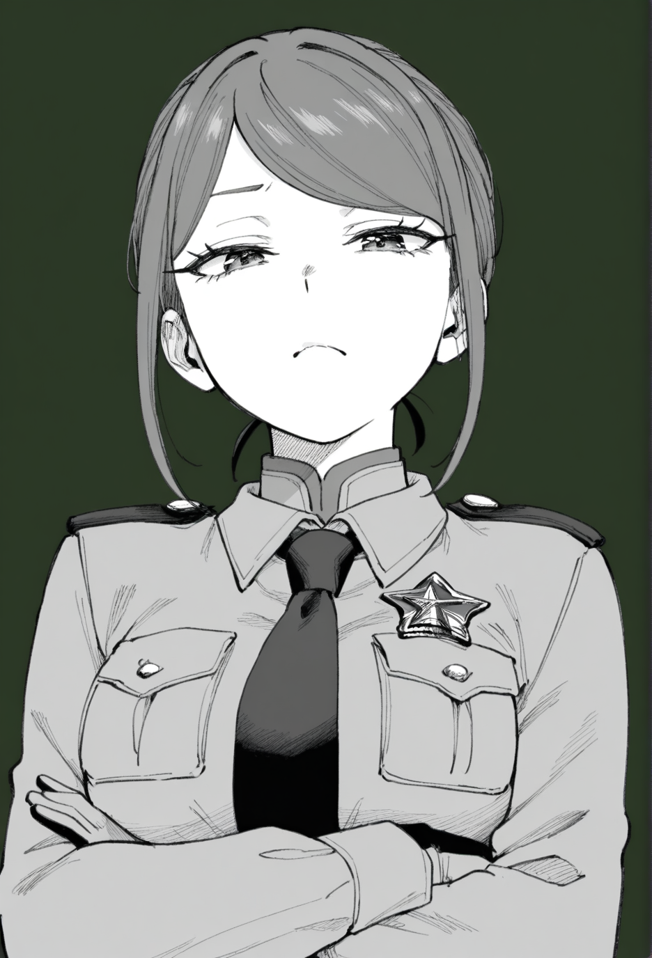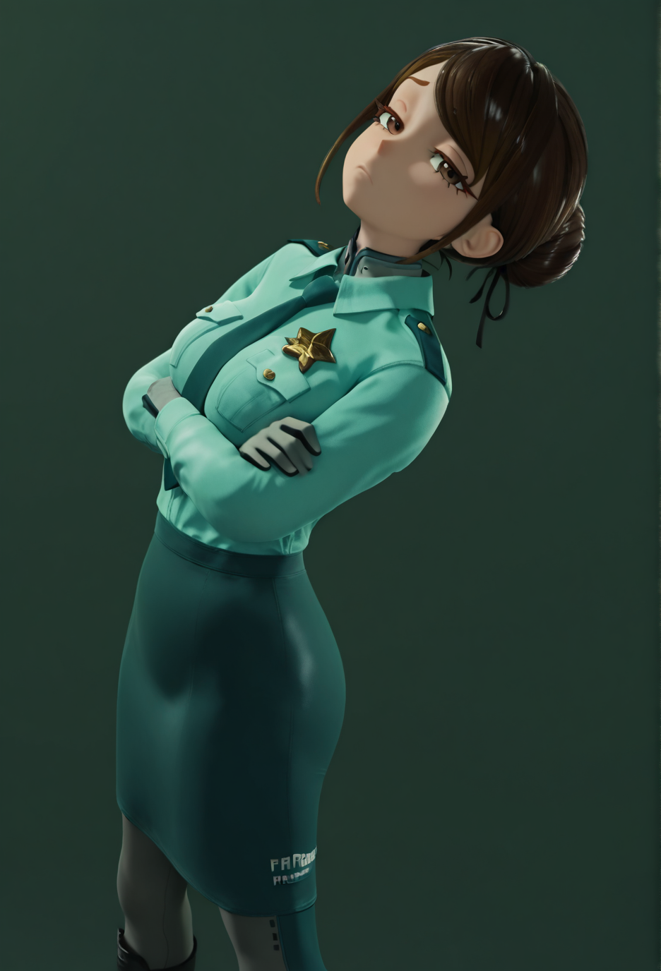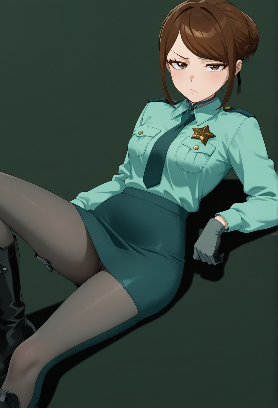 <lora:Kannzaki RixyoukoV1-Nuclear1811-IL>,Kannzaki Rixyouko,brown eyes,brown hair,eyelashes,short hair,hair bun,single hair bun,hair ribbon,black ribbon,swept bangs,sidelocks,df police,df policewoman,df uniform,df police uniform,df necktie,df dark green necktie,df shirt,df green shirt,df collared shirt,df police badge,df pocket,df breast pocket,df long sleeves,df gloves,df two-tone gloves,df dark green gloves,df grey gloves,df elbow gloves,df gloves under sleeves,df skirt,df dark green skirt,df pencil skirt,df pantyhose,df two-tone pantyhose,df dark green pantyhose,df grey pantyhose,df boots,df black footwear,df knee boots,