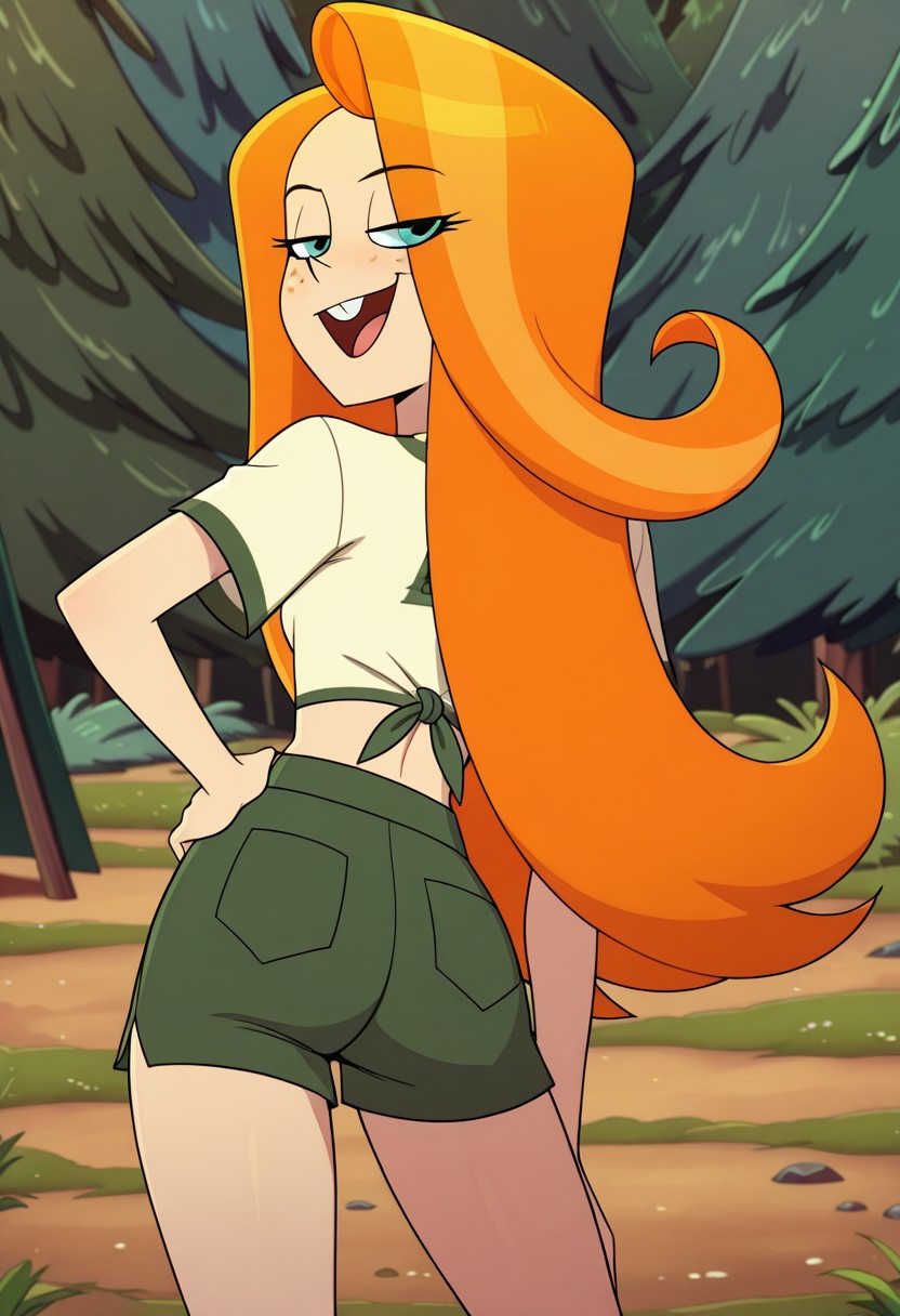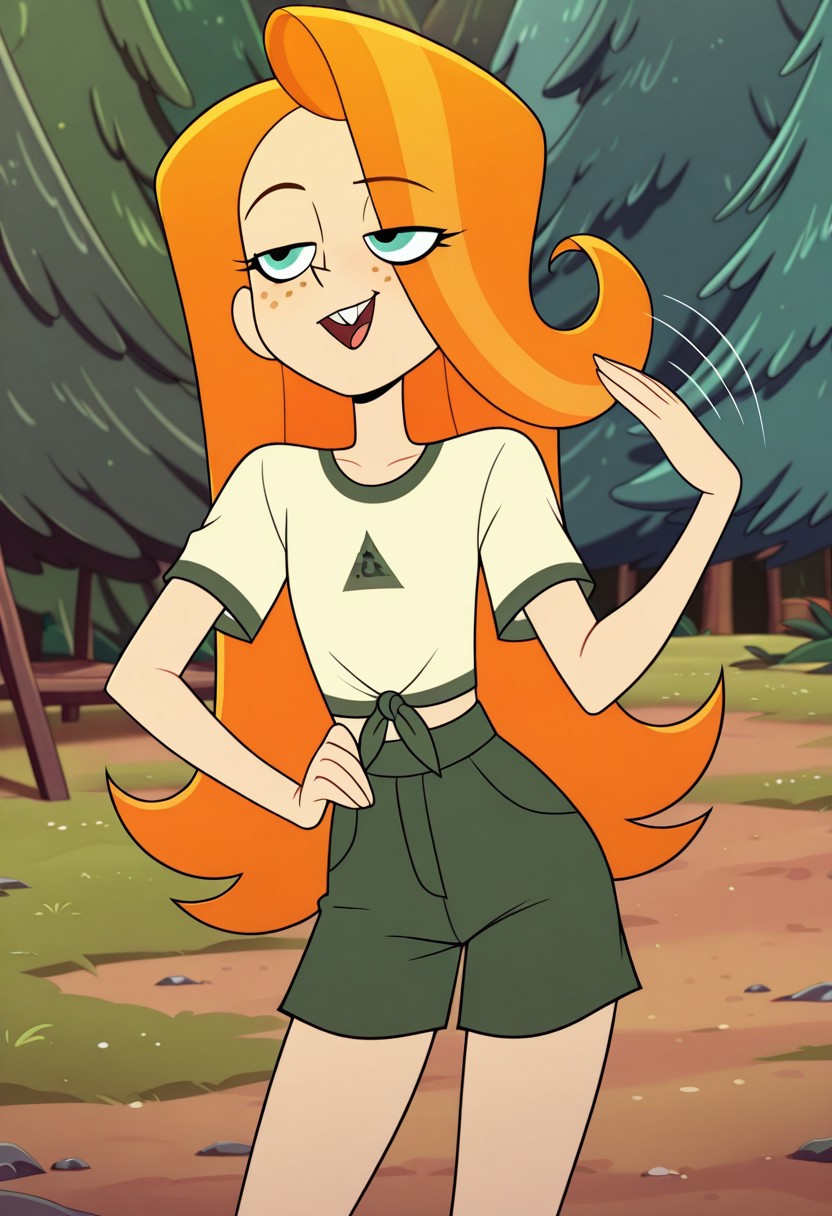 carla, 1girl, solo, long hair, orange hair, aqua eyes, freckles, buck teeth, camp uniform, tied shirt, beige shirt, midriff, green shorts, socks, green shoes,