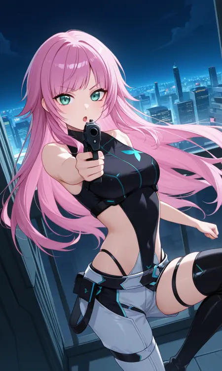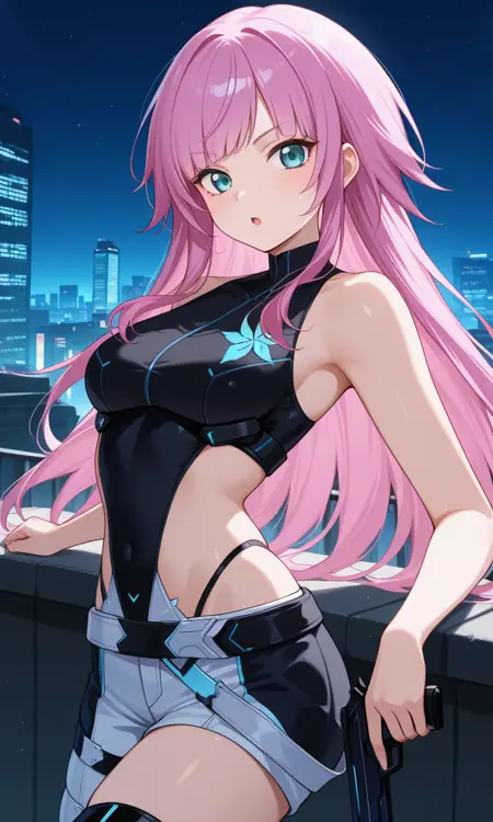 riri cyber off, very long hair, black leotard, sleeveless, highleg, (single pantsleg), white pants, black thigh bootsネガティブ: