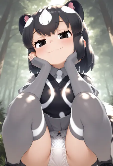 SpottedSkunkXL, 반점 있는 스컹크 (케모노 프렌즈), 스컹크 소녀, 동물 귀, 스컹크 꼬리, 이색 머리카락, 검은 머리카락, 흰 머리카락, 중간 길이 머리, 검은 눈, 이색 조끼, 프린트 조끼, 회색 칼라 셔츠, 단축 소매, 회색 팔꿈치 장갑, 손가락 없음 장갑, 회색 치마, 회색 허벅지 양말,
