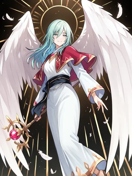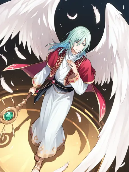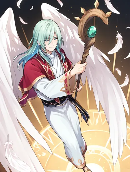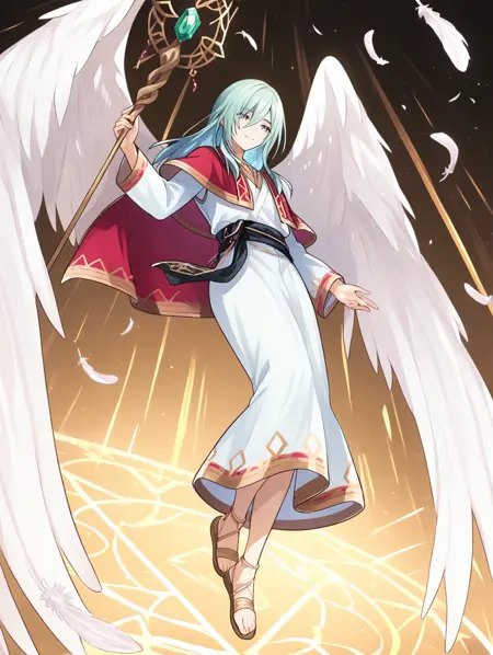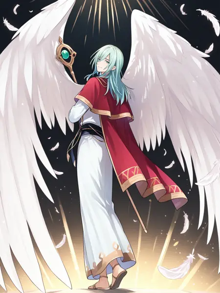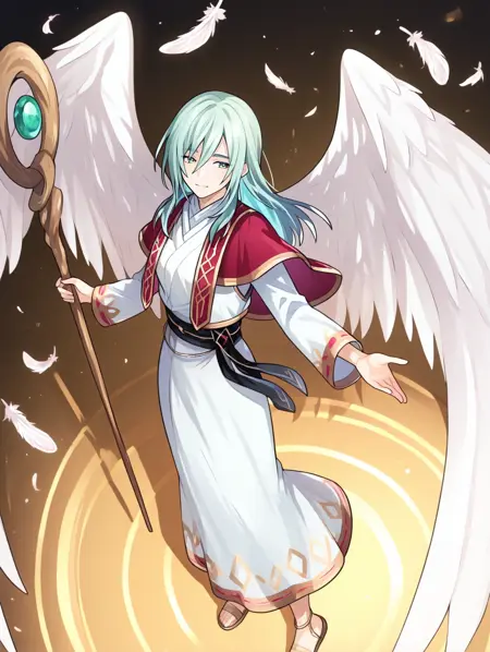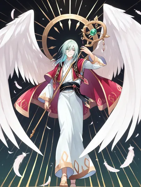 プロンプト例: yosyua,green hair,green eyes,long hair,white robe,red capelet,long sleeves,wings,feathers,sandals,vest,gold trim,black sash,gem,holding staff,gem,