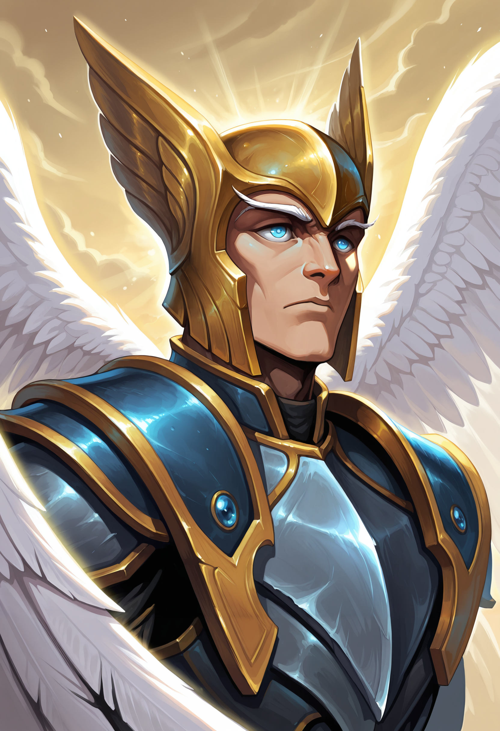 skywrath mage, 1boy, wings, armor, feathered wings, blue eyes, male focus, helmet