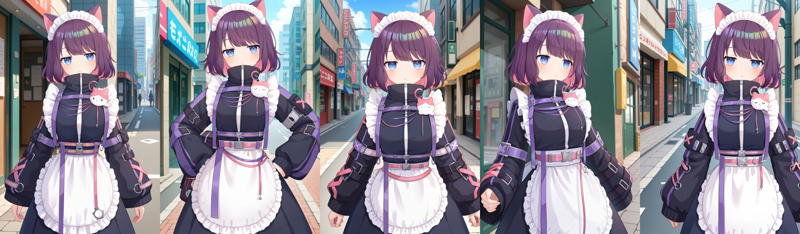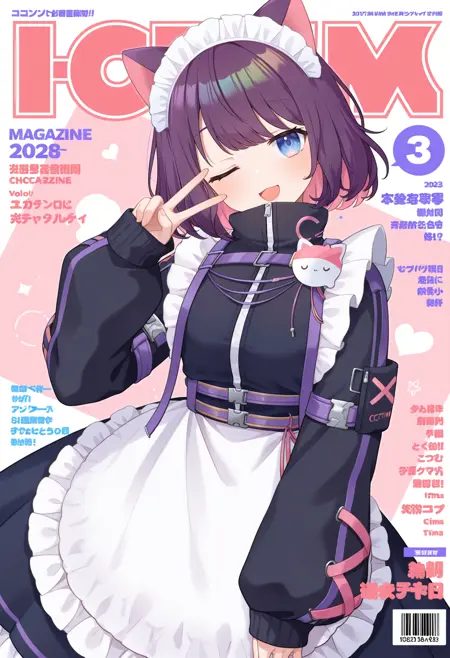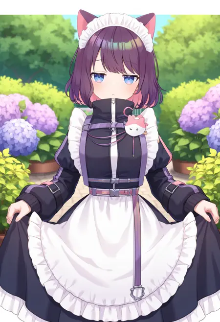 outfit3cctima, short hair, multicolored hair, purple hair, animal ears, maid headdress, blue eyes, chest belt, black jacket, black dress, long sleeves, waist apron