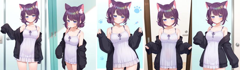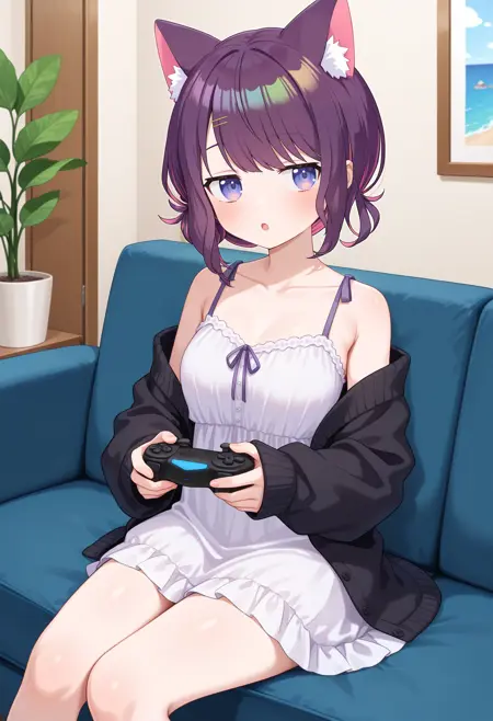 outfit2bbtima, short hair, multicolored hair, purple hair, single hair bun, animal ears, hairclip, collarbone, bare shoulders, camisole, white dress, off shoulder, black cardigan, open cardigan, long sleeves, sleeves past wrists