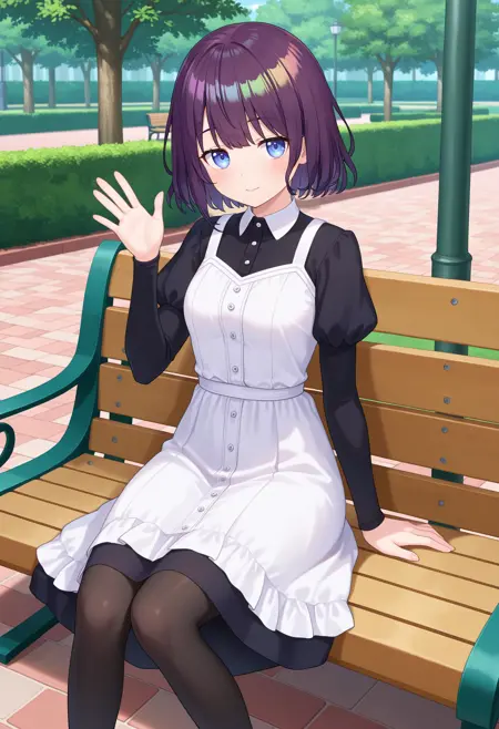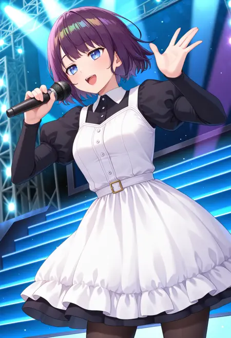 outfit1aatima, short hair, purple hair, blue eyes, collared dress, black shirt, white dress, puffy sleeves, long sleeves, black sleeves, black skirt, black pantyhose