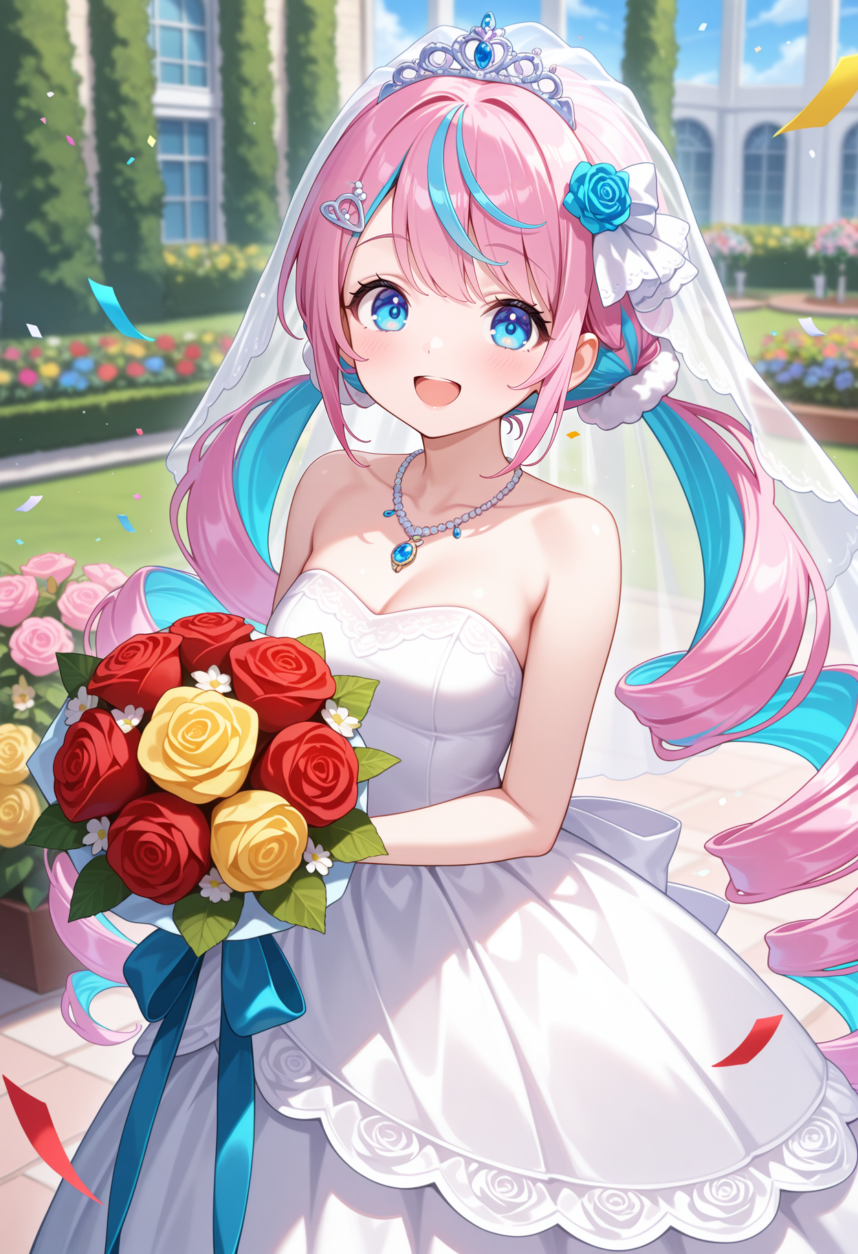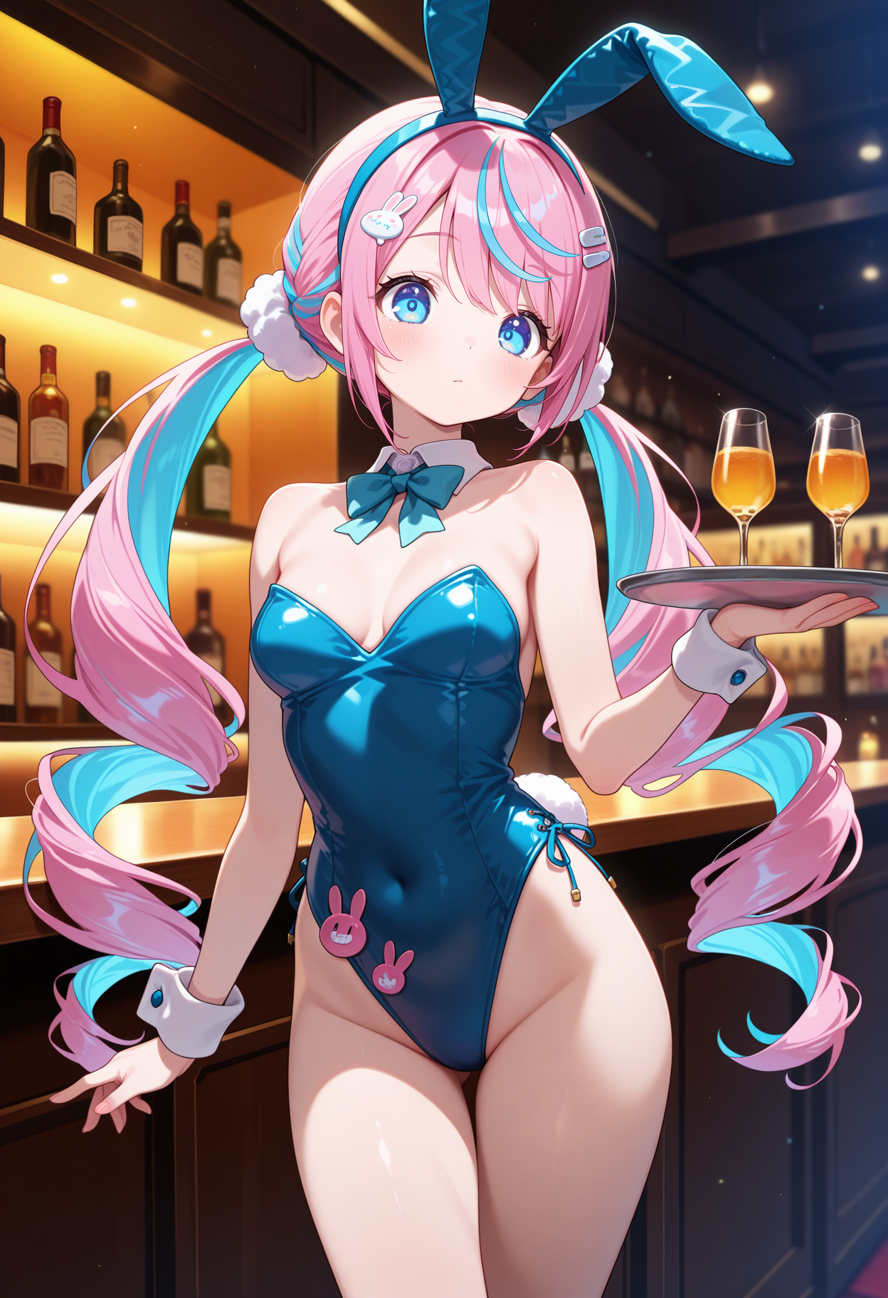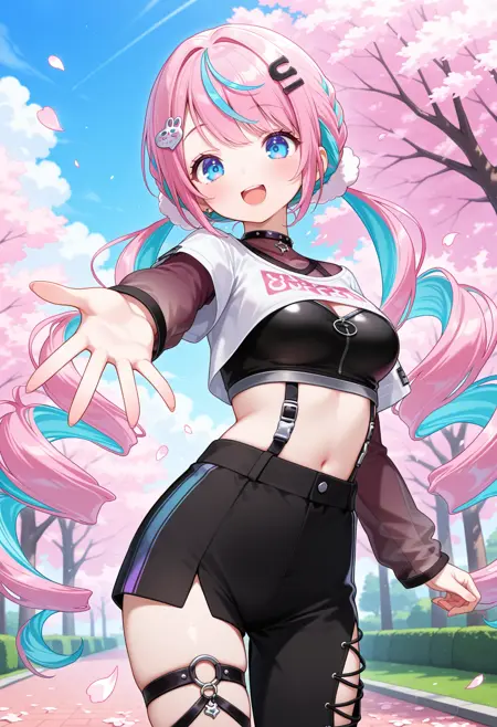 outfit1aaren, long hair, multicolored hair, twin drills, hair ornament, blue eyes, black choker, see-through, crop top, shrug (clothing), undershirt, white shirt, short over long sleeves, suspenders, single pantsleg, black pants, thigh strap