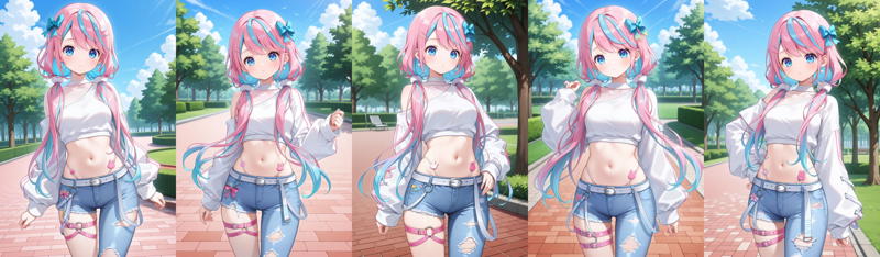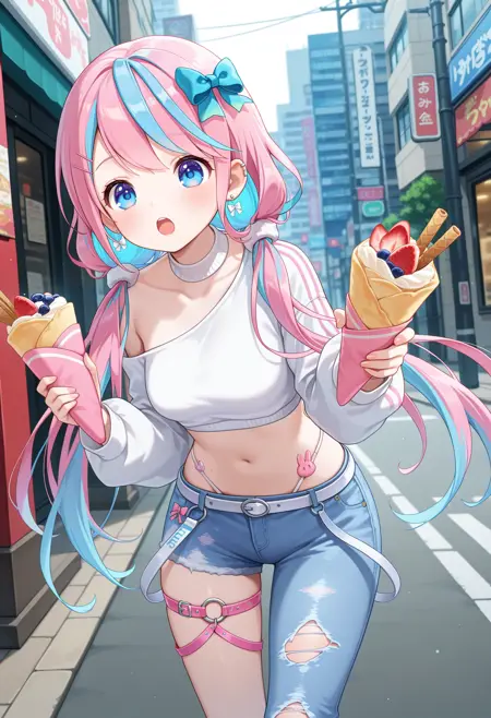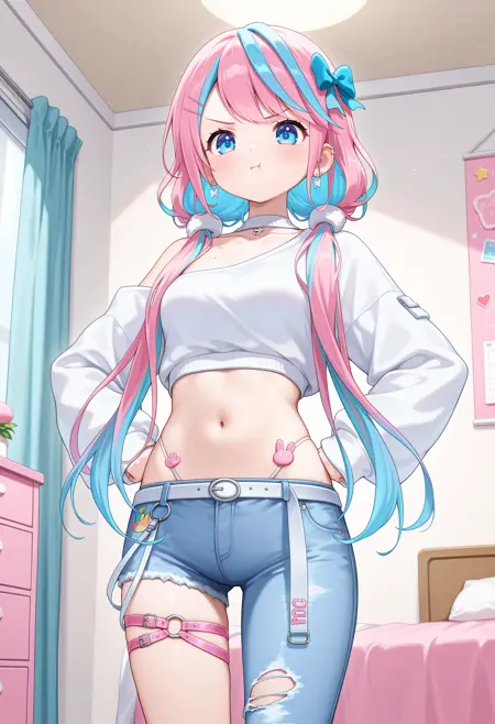outfit2bbren, long hair, multicolored hair, low twintails, hairclip, hair bow, earrings, blue eyes, crop top, off-shoulder shirt, white shirt, long sleeves, panty straps, white belt, single pantsleg, torn pants, jeans, blue pants, thigh strap