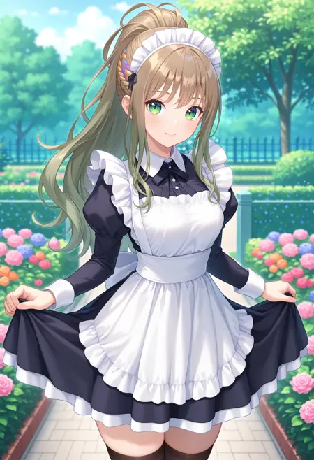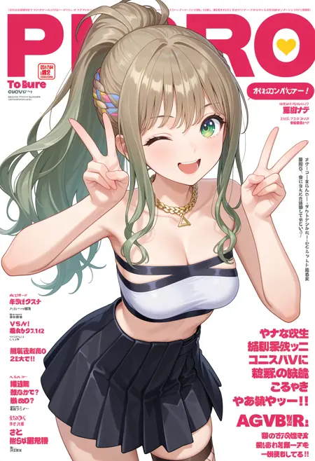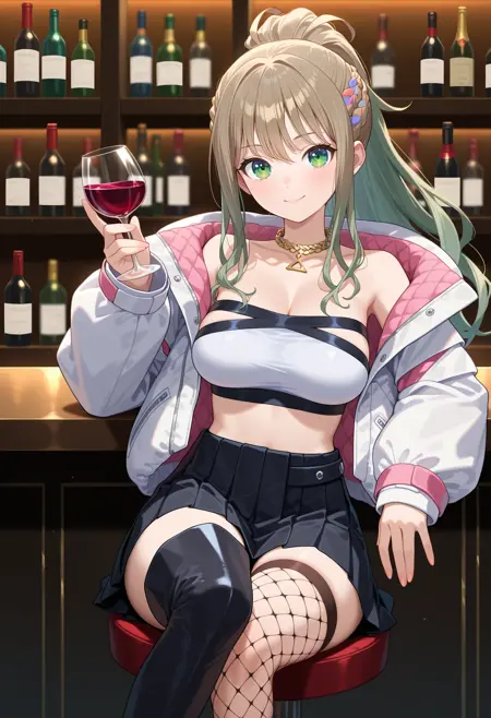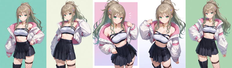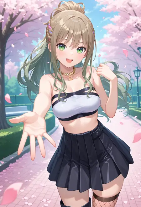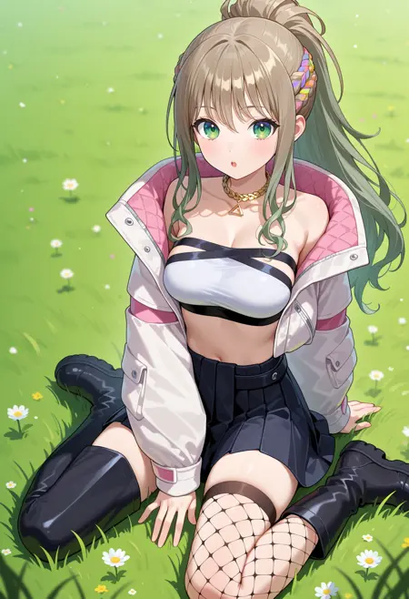 outfit1aaiori, long hair, brown hair, ponytail, braid, green eyes, necklace, white tube top, white jacket, long sleeves, midriff, black skirt, asymmetrical legwear, single thighhigh, fishnet thighhighs, thigh boots