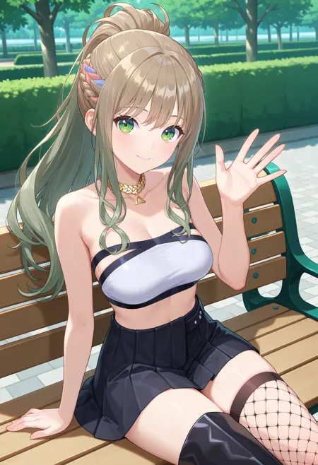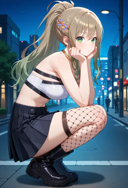 outfit1-1aaiori, long hair, brown hair, ponytail, braid, green eyes, necklace, white tube top, bare arms, midriff, black skirt, asymmetrical legwear, single thighhigh, fishnet thighhighs, thigh boots