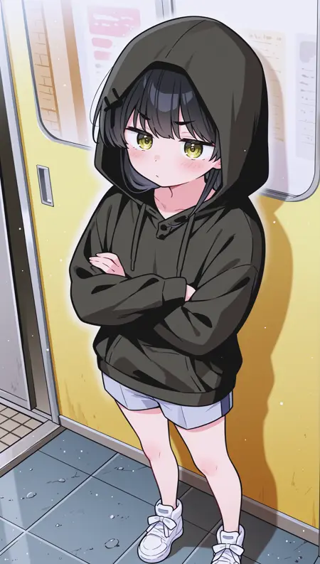 • long sleeves, shorts, hood, hoodie, sneakers, hood up