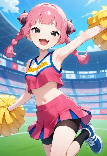 outfit3cccoral, pink hair, twintails, hair ornament, black eyes, fang, bare shoulders, sleeveless shirt, detached sleeves, black sleeves, midriff, black skirt, thigh cutout, black pantyhose
