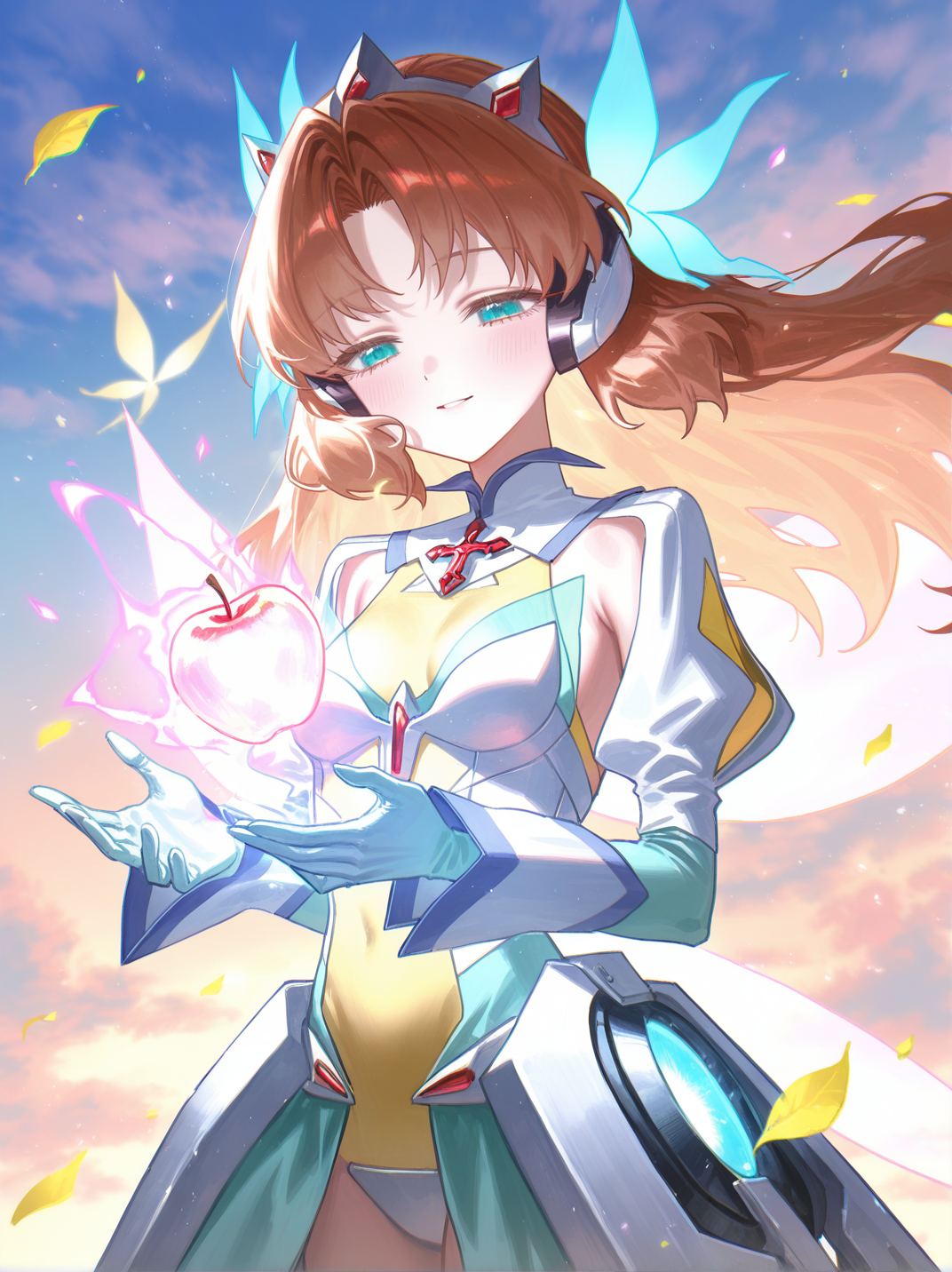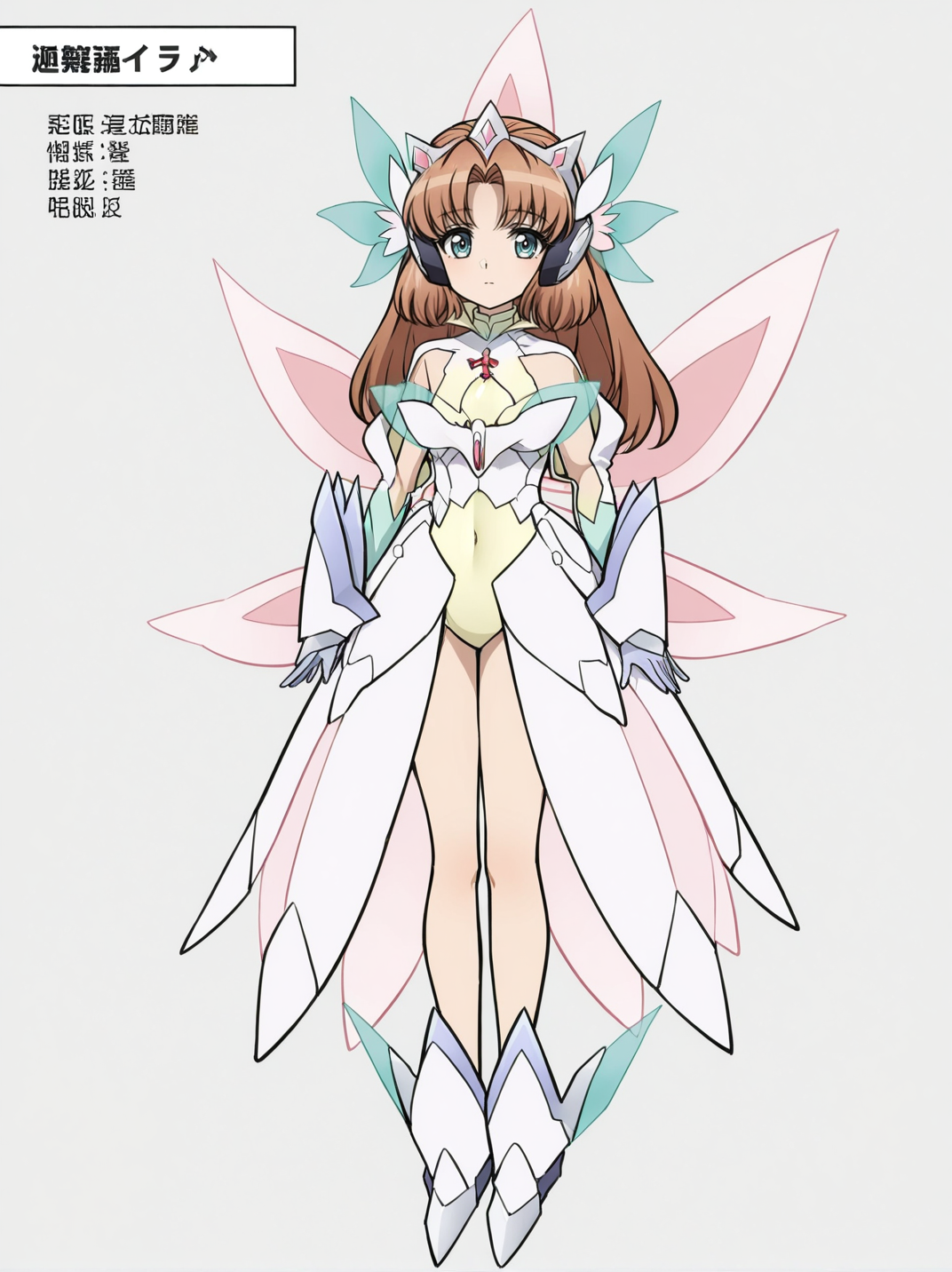 衣服1(clothes1):armor, armored boots, mecha musume, medium breasts, navel, showgirl skirt, headgear, armored dress, yellow leotard, elbow gloves, fairy wings,