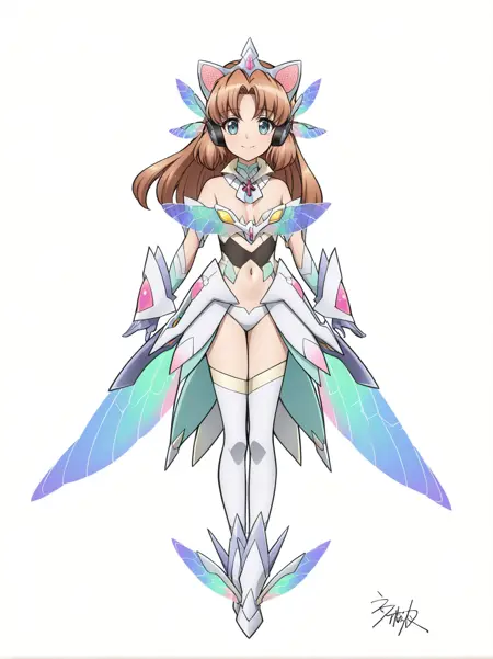 衣服2(clothes2):armor, armored boots, armored dress, detached collar, fake animal ears,low wings, mecha musume, navel, panties, revealing clothes, showgirl skirt, thigh boots, white thighhighs, elbow gloves, tiara, official alternate costume, head wings, headphones