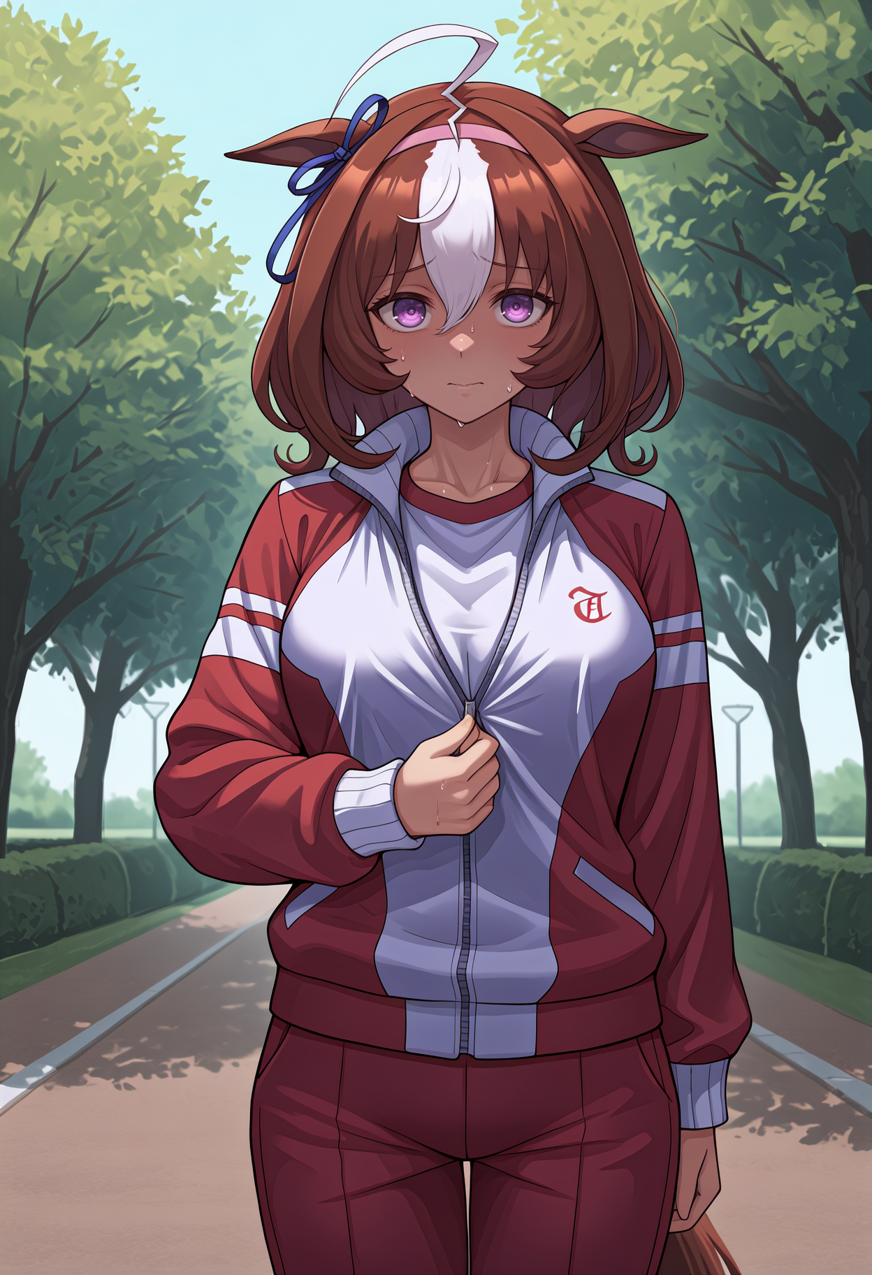 기본 복장: me1sh0def, 말 꼬리, 중간 길이 머리, 줄무늬 머리, 갈색 머리, 흰색 머리, ahoge, 눈 사이 머리, 분홍색 헤어밴드, 동물 귀, 귀 리본, 파란 리본, 보라색 눈, 흰색 셔츠, 중앙 프릴, 목 리본, 빨간 리본, 노랑 리본, 팔꿈치를 넘는 소매, 파란 조끼, 허리 아래, 흰색 장갑, 파란 치마, 레이스 장식 치마, 흰색 팬티스타킹, 어깨 가방, 가슴 사이 스트랩, 큰 가슴