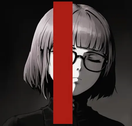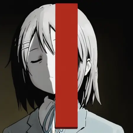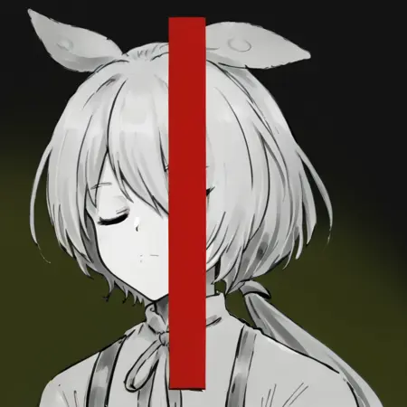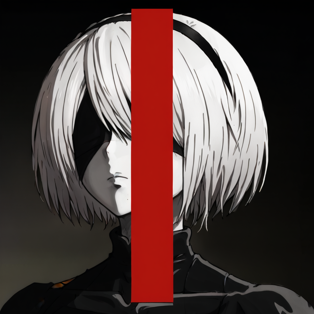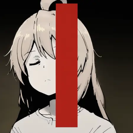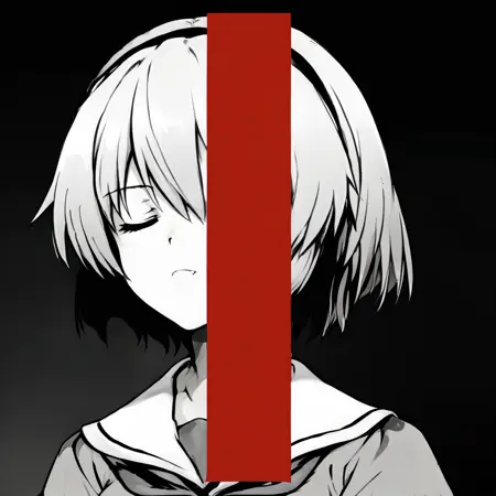 ksngh, hair over one eye, chiaroscuro lighting, dark background, monochrome, high-contrast, side lighting, graphic design, vertical red bar,closed eyes,closed mouth ,silhouette, expressionless
