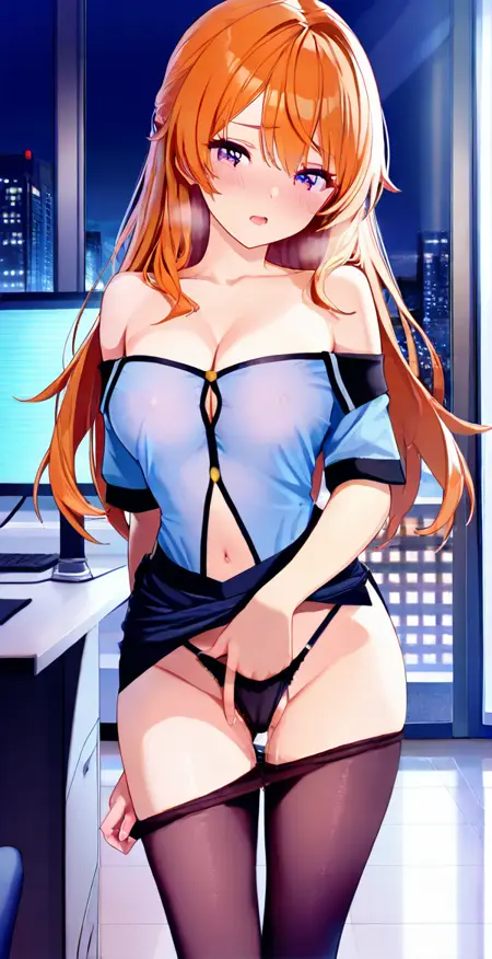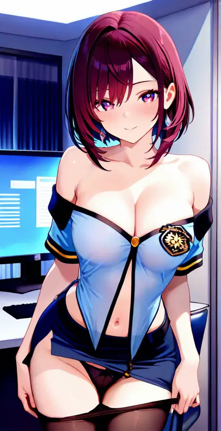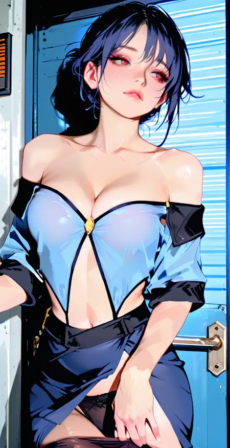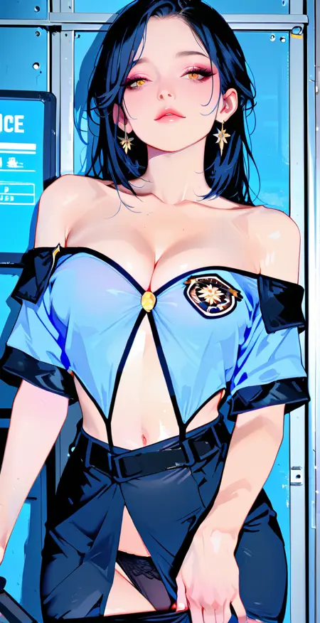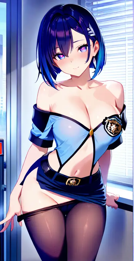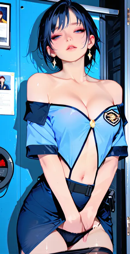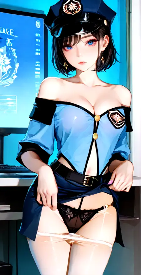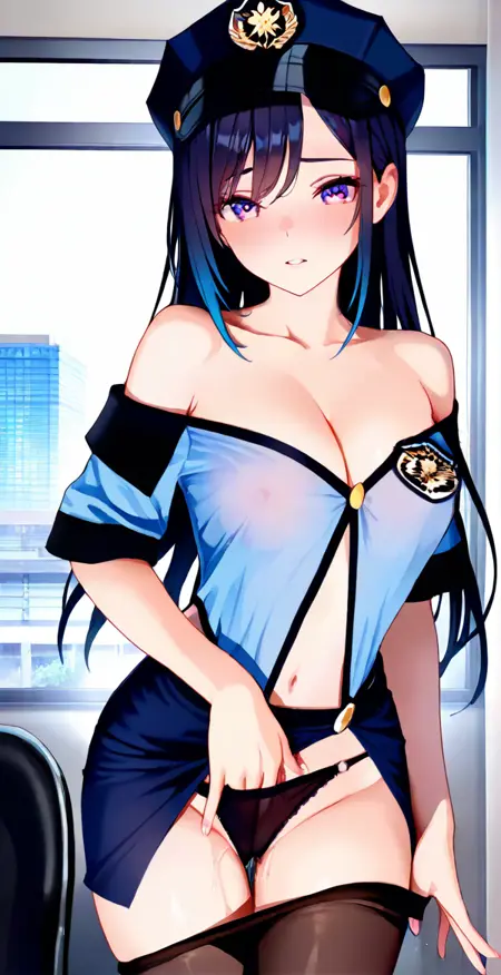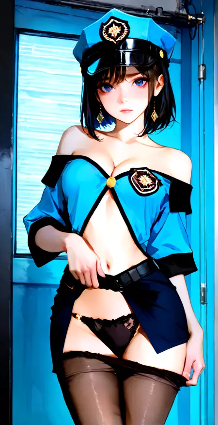 police_uniform, navel, collarbone, cleavage, blue shirt, underwear, panties, bare shoulders, black panties, police uniform, skirt, pantyhose, pantyhose pull, police, policewoman