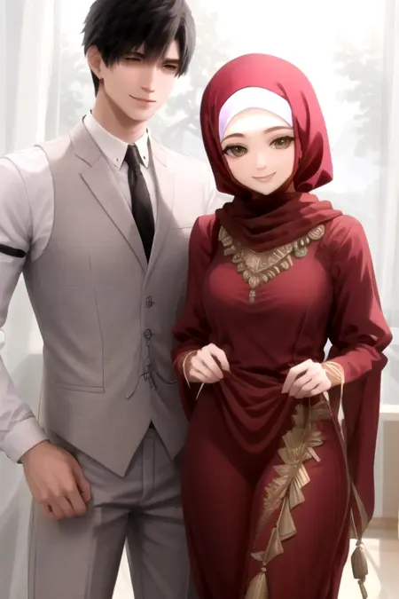 ZayneMalay, a man and (a woman, hijab), hetero, standing, smile, cowboy shot