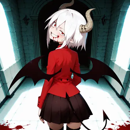 Originalhanten,shorthair,demon horns,demon wings,red shirt,demon tail,red_eyes,grin,white_hair,black tie,nail polish,demon_girl,Sharp teeth,silme,Black boots,long_sleeves,black pleated skirt, funamusea style,
