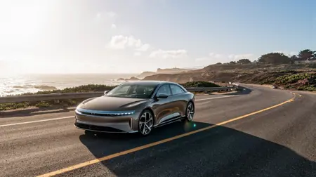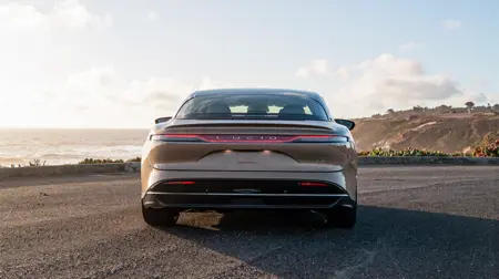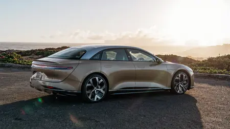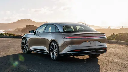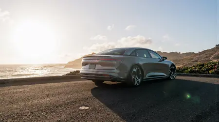 The Air's design blends a "California futurism" aesthetic with high-end luxury. The sleek, aero-driven exterior looks "like nothing else on the road," though the aggressively low roofline, a key to its efficiency, can compromise ease of entry and exit. Inside, the exclusive "Santa Monica" interior theme features a sophisticated mix of Nappa leather, Alcantara, and sustainable textiles, creating a chic, mid-century modern feel. The miniaturized powertrain creates a capacious cabin with generous legroom, but the underfloor battery pack results in a high floor and a "knees-up" rear seating position, a notable ergonomic flaw in an otherwise exemplary long-distance cruiser.