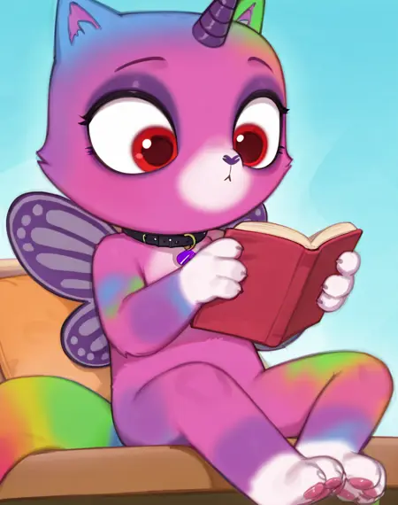 有益提示:1girl, anthro, feline, unicorn horn, rainbow fur, butterfly wings, rainbow tail, collar, heart-shaped tag