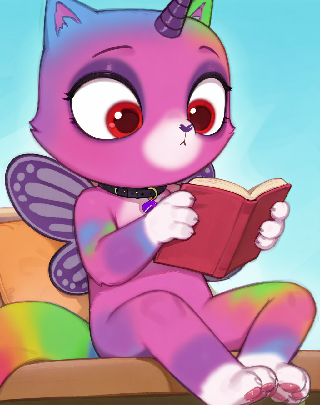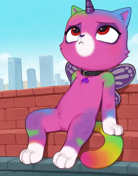 도움이 되는 키워드: 1girl, 앤트로, 고양이, 유니콘 뿔, 무지개 털, 나비 날개, 무지개 꼬리, 목줄, 심장형 태그
