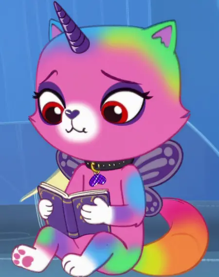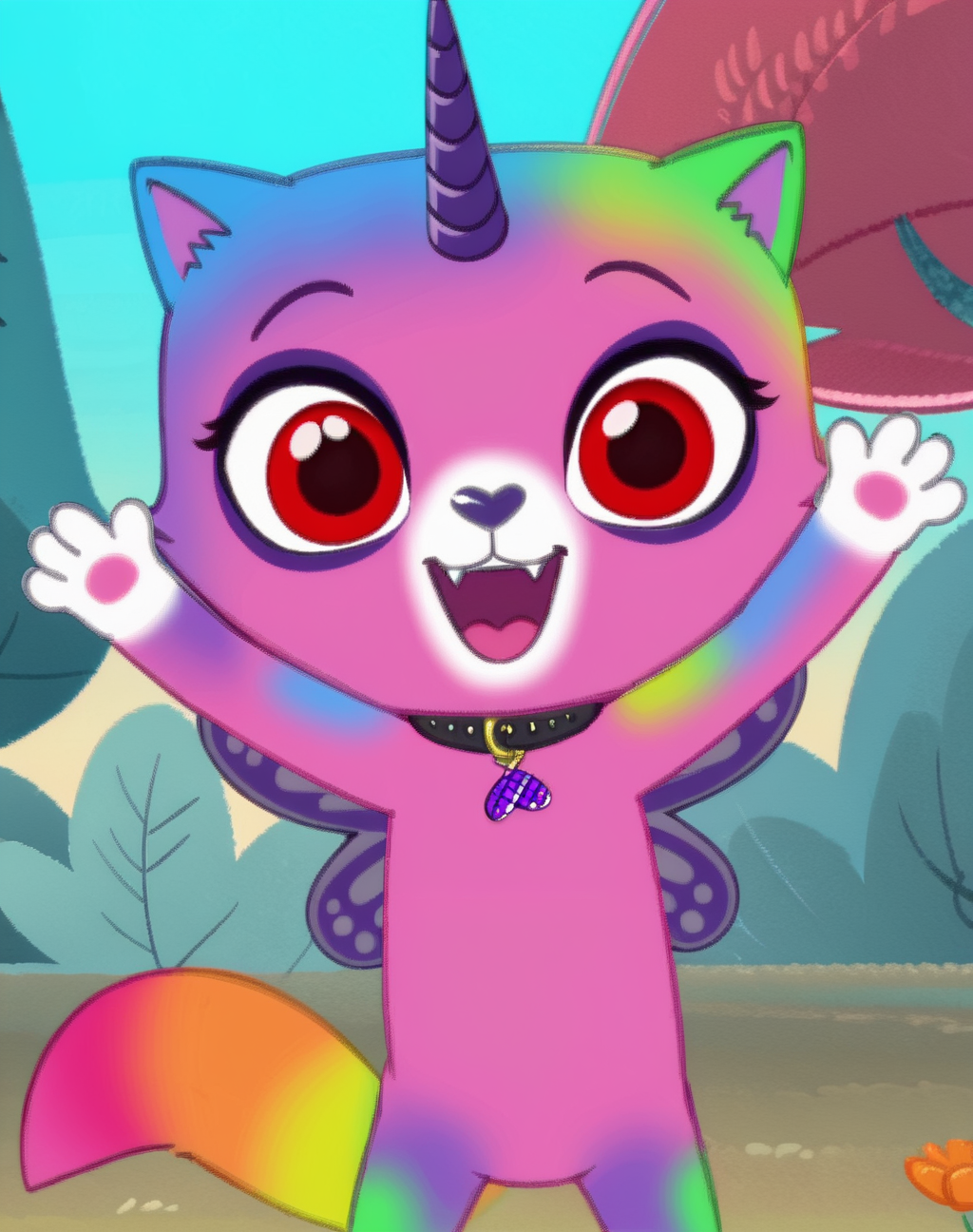 도움이 되는 키워드: 1girl, 앤트로, 고양이, 유니콘 뿔, 무지개 털, 나비 날개, 무지개 꼬리, 목줄, 심장형 태그
