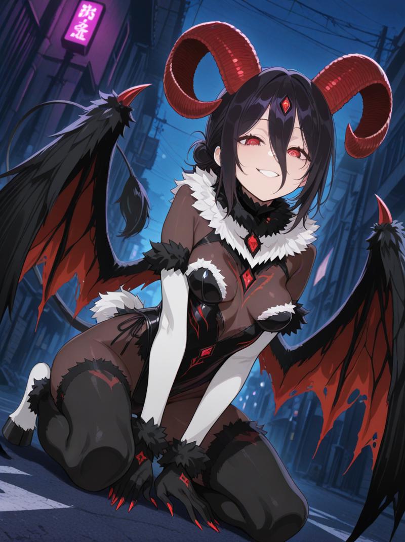 Trigger word : wings, white fur, black fur, multicolored fur, curled horns, monsterification, hooves, claws, tail, @ @, long fingernails, forehead jewel, goat girl, black skin, fur trim,