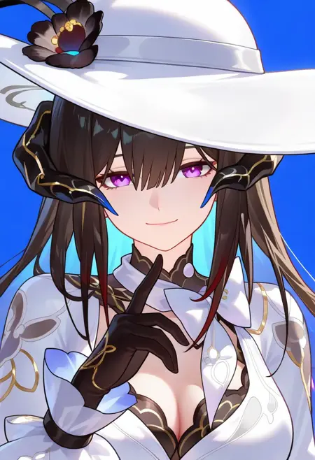 constance_(honkai:_star_rail),1girl,long hair,purple eyes,parted lips,wearing a white dress,left hand near chest,ornate belt,black gold clawed glove (right hand),wide-brimmed white hat,black flower (on left side of hat),