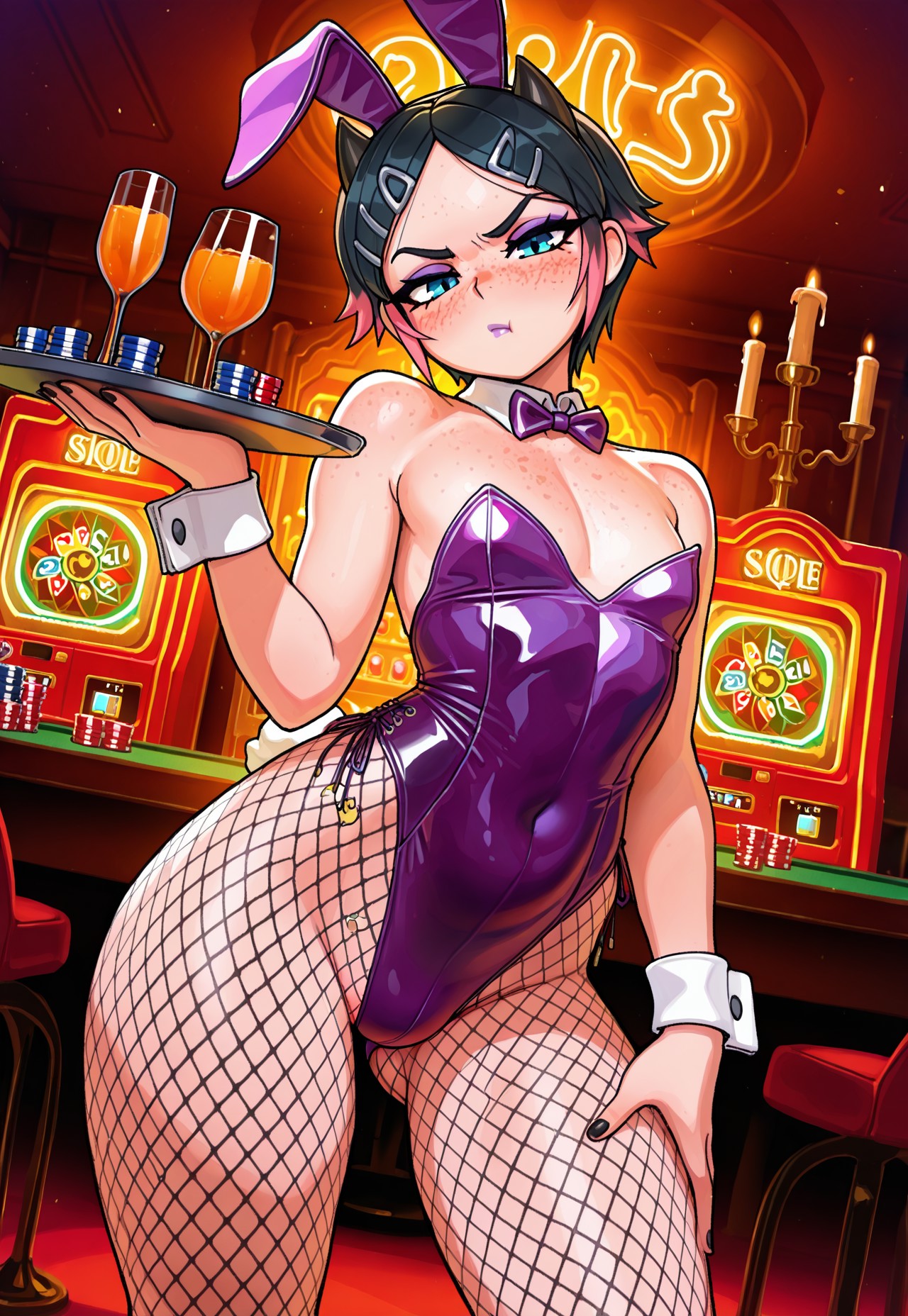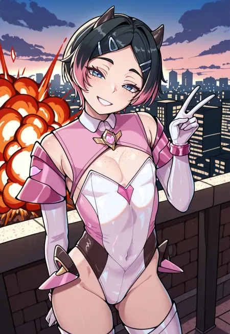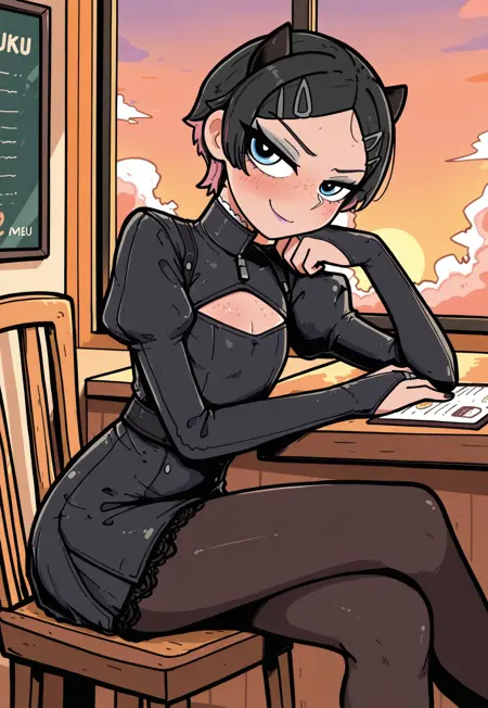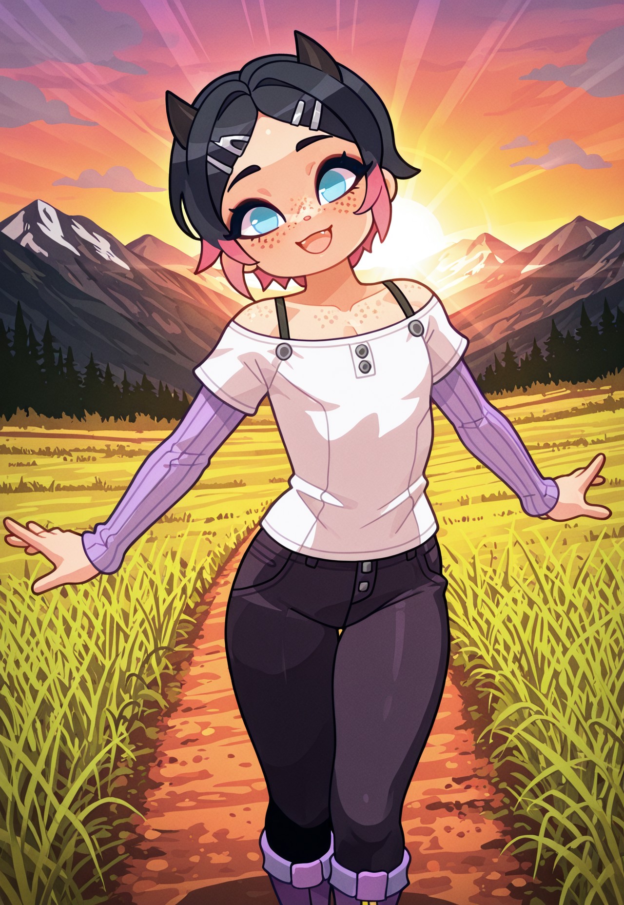 clvl,1boy,trap,flat pectorals,short hair,black hair,pink tips,small horns,parted bangs,blue eyes,freckles,hairclips,