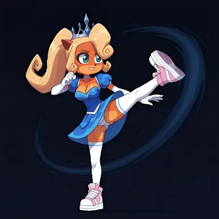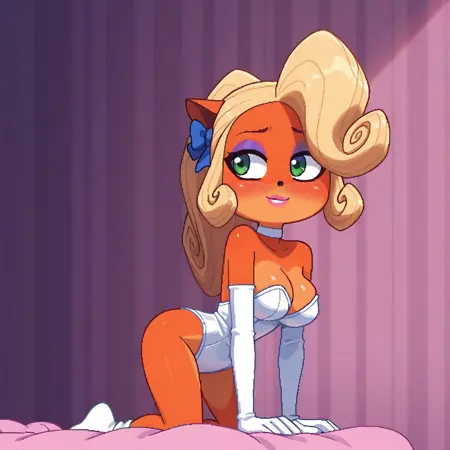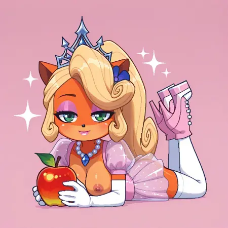 kempferzero, 1girl, solo, coco_bandicoot, furry, furry female, blonde hair, breasts, green eyes, long hair, ponytail, animal ears, colored skin, body fur,