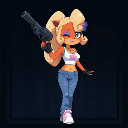 flo, solo, 1girl, solo, coco_bandicoot, furry, furry female, blonde hair, animal ears, breasts, long hair, animal nose, green eyes, ponytail, body fur, small breasts,