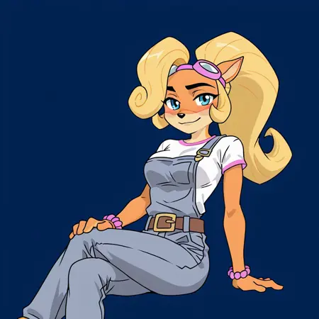 flo, solo, 1girl, solo, coco_bandicoot, furry, furry female, blonde hair, animal ears, breasts, long hair, animal nose, green eyes, ponytail, body fur, small breasts,