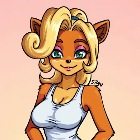 flo, solo, 1girl, coco_bandicoot, ファリー, ファリー女性, 金髪, 動物の耳, 胸, 長髪, 動物の鼻, 緑の目, ポニーテール, 体毛, 小さな胸,