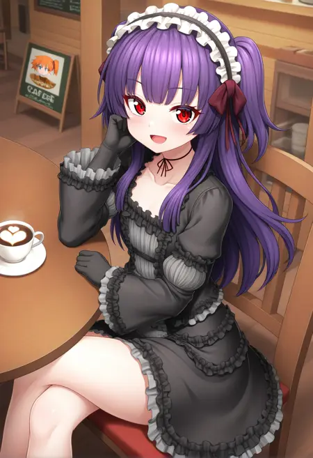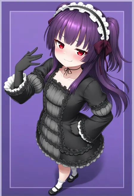 외모: 평평한 가슴, 빨간 눈, 긴 머리카락, 보라색 머리카락, 앞머리, 양쪽 올림, 리본