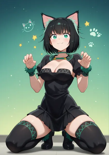 1girl, cat ears, cat tail, short hair, black hair, green hair, hair highlights, heterochromatic hair, choker, animal features, human-animal hybrid, tail, ears, large eyes, green eyes, blue eyes, young, anime-style