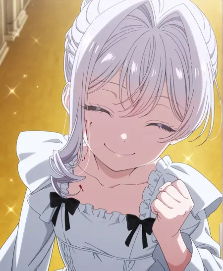 blood, smile,closed eyes, clenched hand, hand up, blood on face,