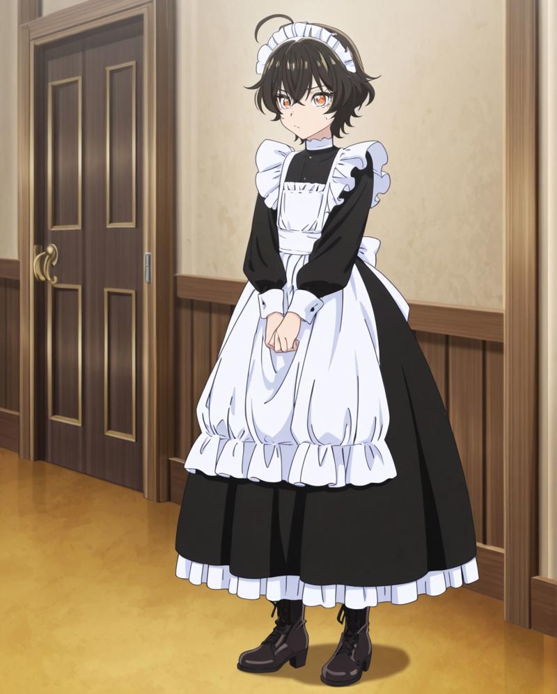 1boy, male focus, black hair, maid, orange eyes,solo,