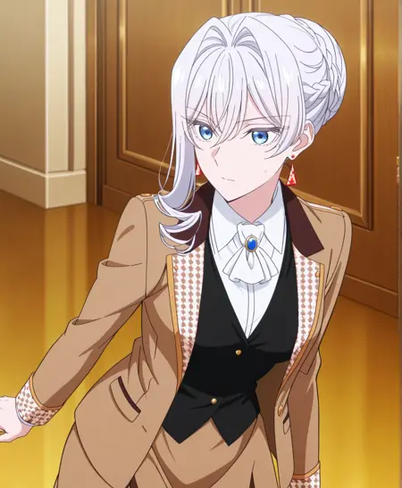 black vest, white shirt, white ascot,brown jacket, collared shirt, vest, brown skirt,s_Scarlet,