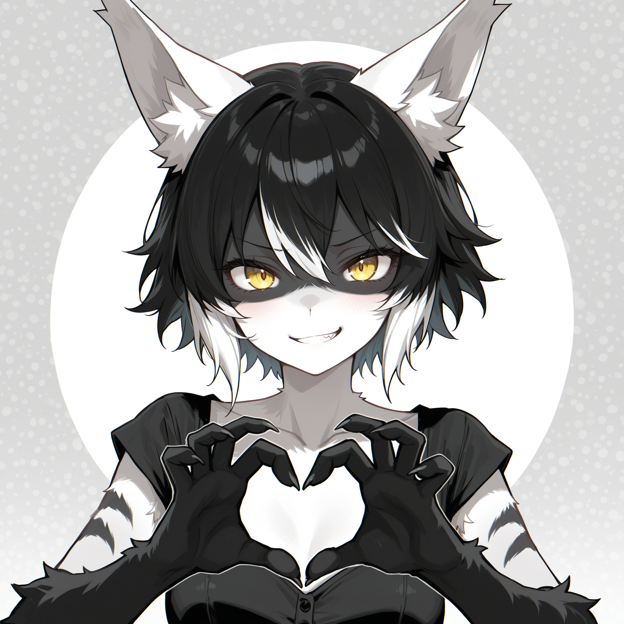 ep170mg, monster girl, white animal ears, short tail with black tip, body fur, two-tone fur, short hair, black hair, white hair, claws, yellow eyes