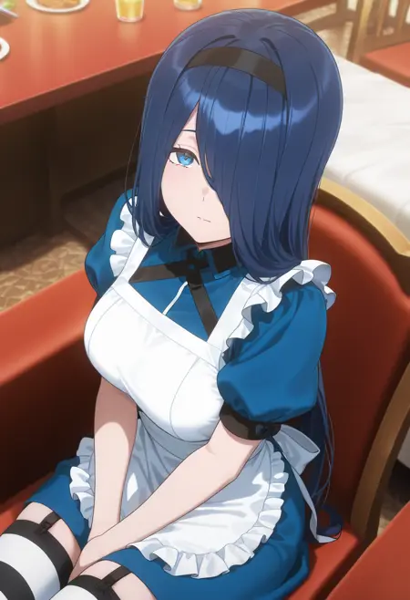 외모 태그: 1girl, 긴 머리, 큰 가슴, 파란 눈, 파란 머리, 한쪽 눈 위의 머리카락