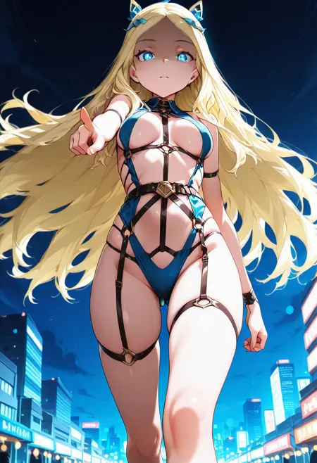 Alice_Alter, very long hair, blonde hair, blue eyes, revealing clothes, straps, belts