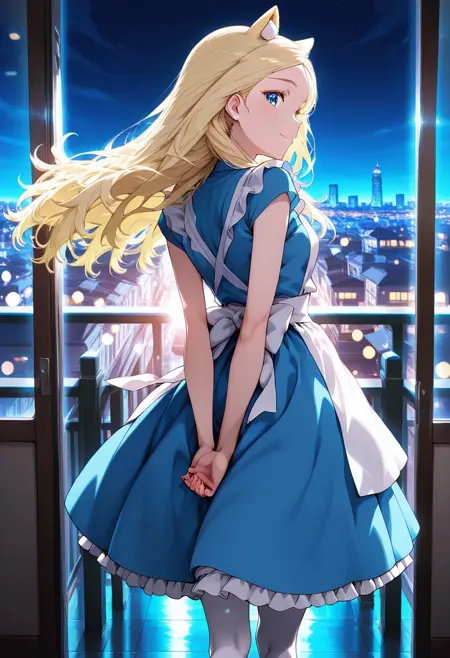 Alice_Anotherbible, long hair, blonde hair, animal ears, blue eyes, blue dress, short sleeves, white apron, white pantyhose