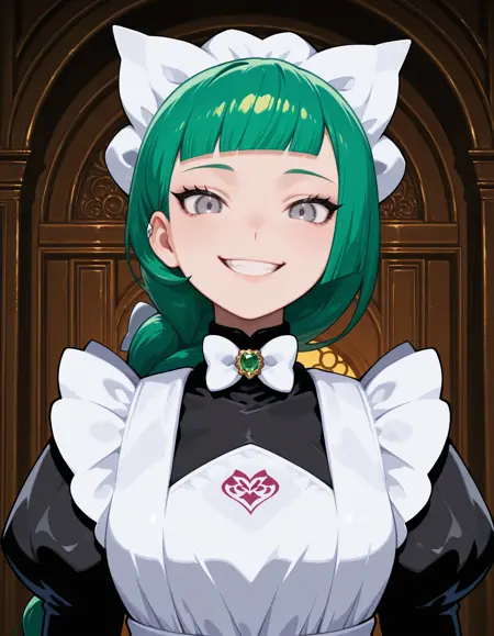 녹색 머리카락, 매우 긴 머리카락, 둔한 앞머리, 단일 땋은 머리, 회색 눈, 검은 속눈썹, 하얀 피부, 귀에 3개의 구멍,
