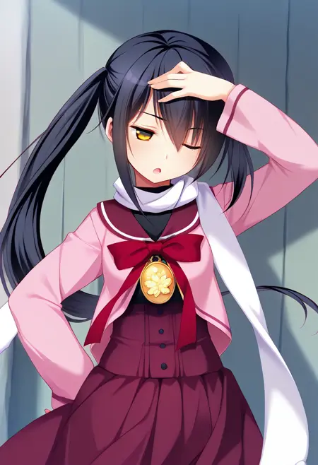 The lora is mostly trained on sprites, since there are just a few event images of her. The casual outfit and school uniform came out quite good, but her rabbit scarf didn't bake in very well, so you can use "white scarf" instead.