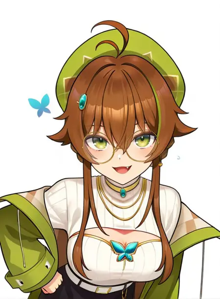 DahliaKaiVT, 긴 머리, 가슴, 큰 가슴, 갈색 머리, 머리 장식, 중간 크기 가슴, 아호게, 땋은 머리, 다채로운 머리카락, 녹색 머리카락, 안경, 가상 유튜버, 스트라이프 머리카락, 안테나 머리카락, 눈 사이의 머리카락, 녹색 눈