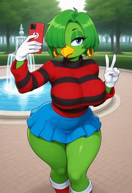 Tekno the Canary, green skin, yellow beak, blue eyes, green hair, hair over one eye, big gold earrings, red and black striped sweater, blue skirt, white gloves, red shoes