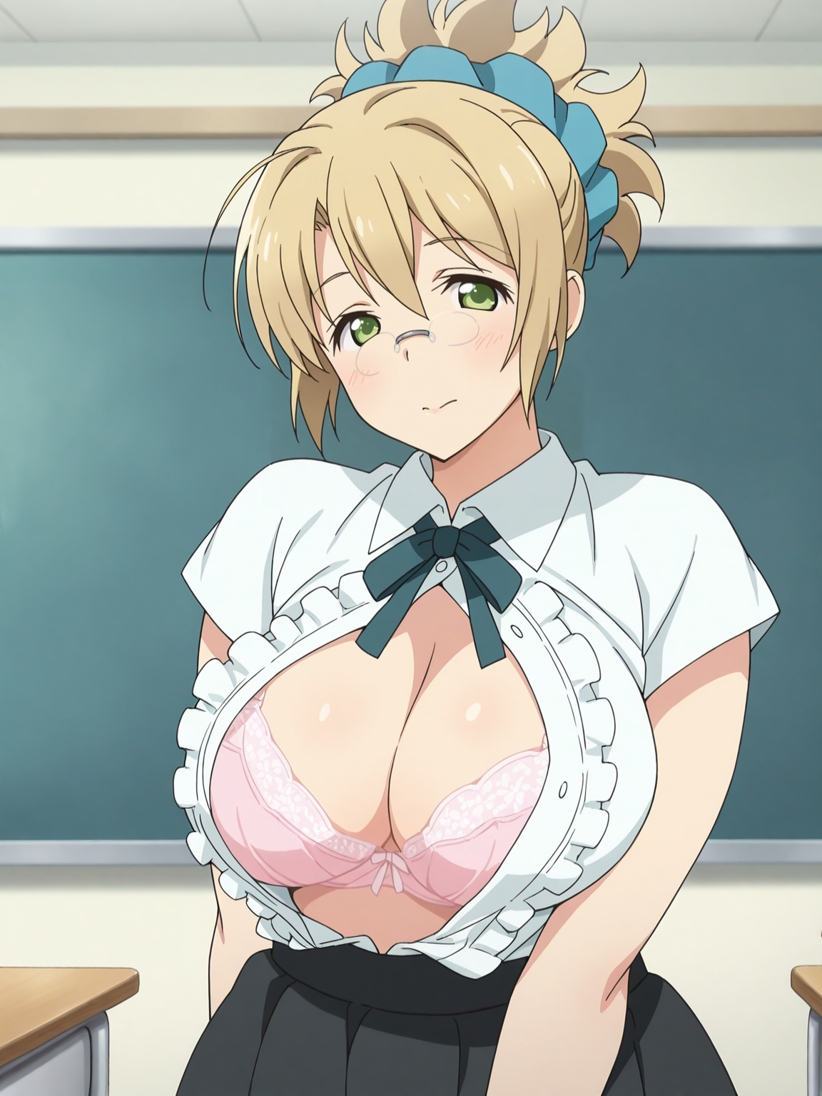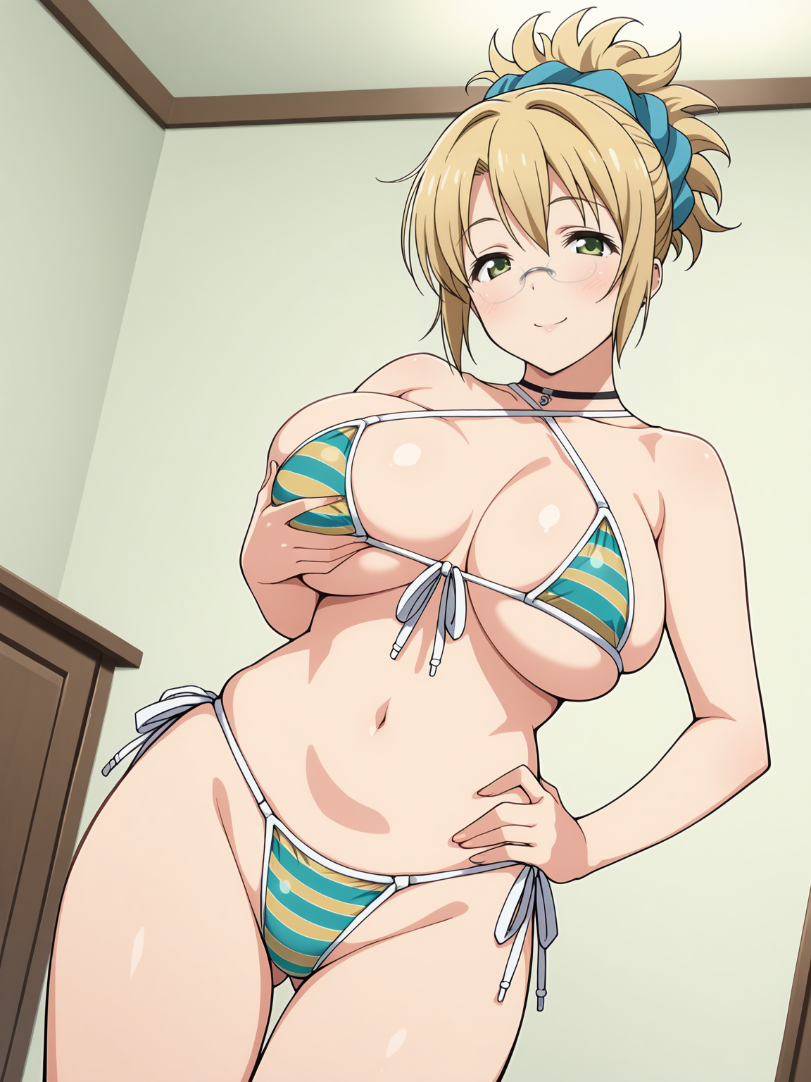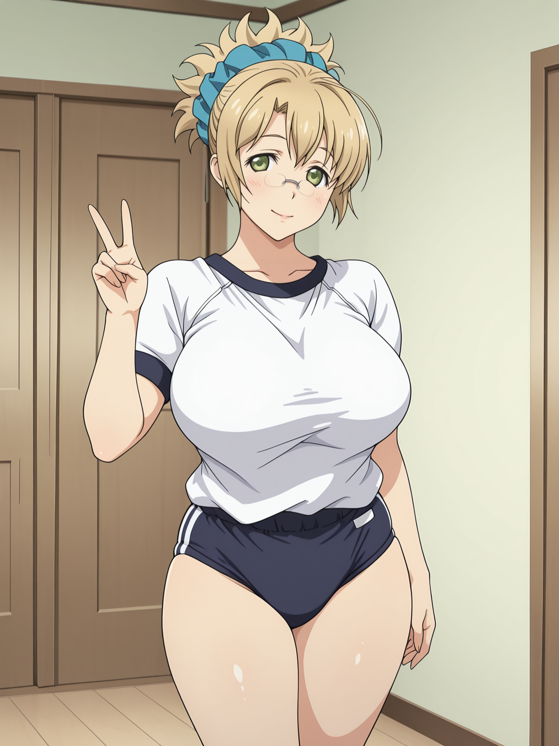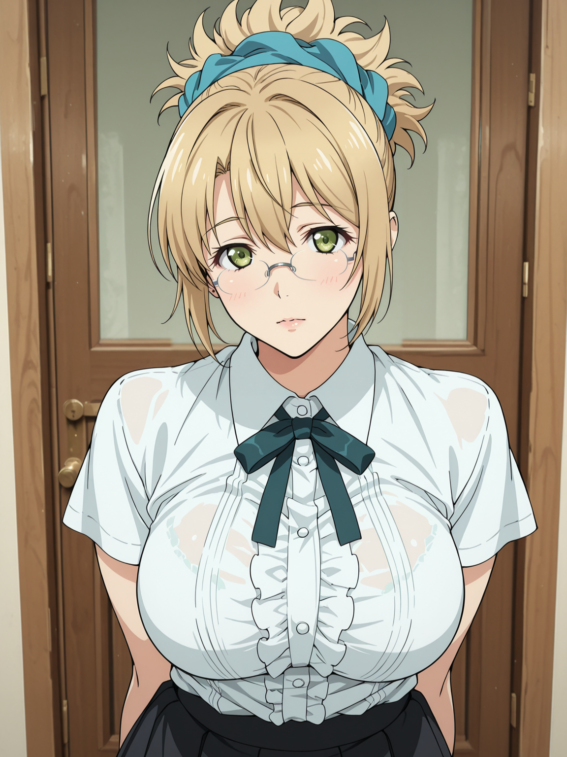 Apperance: misasen, blonde hair, short hair, green eyes, large breasts, ponytail, blue scrunchie, nose glasses