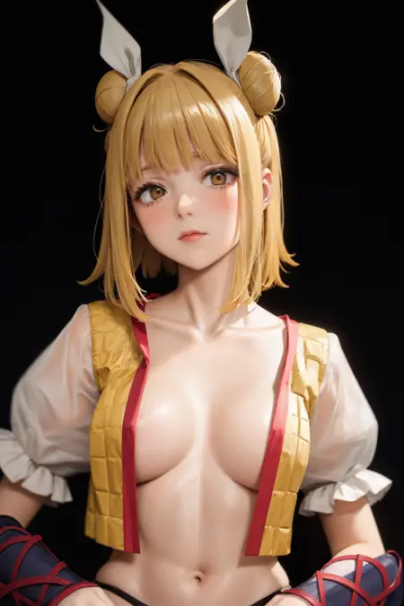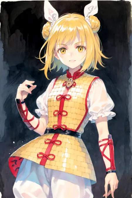 tag:joutouguu mayumi,1girl,double bun,blonde hair,short hair,hair ribbon,yellow eyes, short sleeves,vambraces, armored dress, white shirt,white pants,