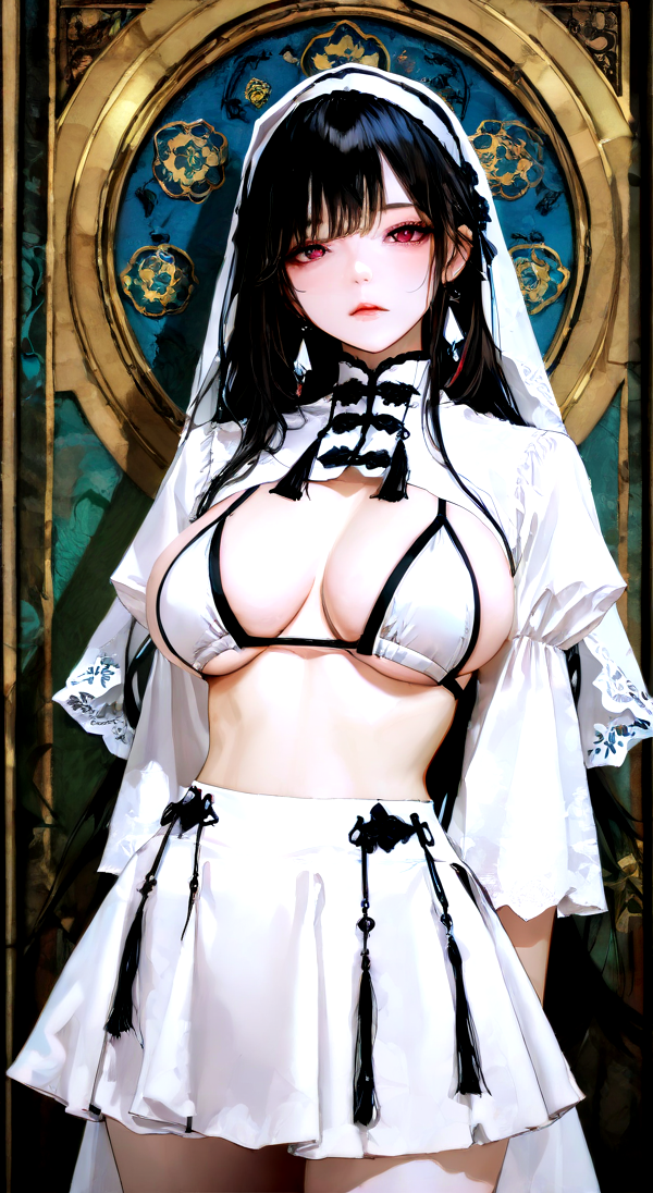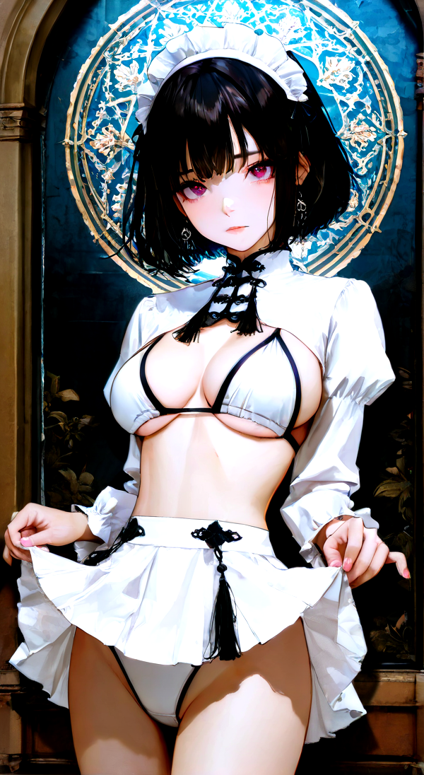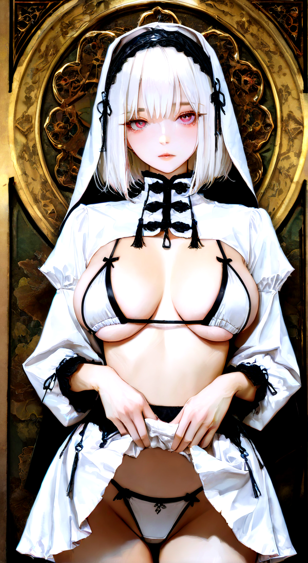 Prompt word: white_skirt_bikini, bikini, white skirt, clothes lift, shrug \\(clothing\\)